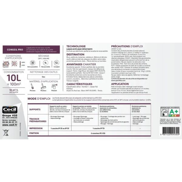 Adhérence renforcée sur tous supports: plâtre, béton, ciment, brique, bois, radiateurtrès bon pouvoir couvrant et garnissantsans trace de reprise: adaptée pour les grandes surfaces et les plafondshaute lessivabilité et forte résistance au lustragel'application d'une sous-couche et l'utilisation de matériel de qualité améliorent l'aspect final et le rendementrendement : 10m²/L par coucheséchage : Hors poussière : 30 min / Recouvrable : 6h / Complet : 24h Dangereux respecter les précautions d'emploi existe aussi en 0.5 L et 2.5L .