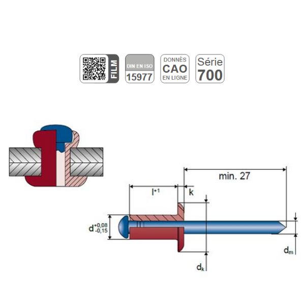Rivet aluminium, tige acier, boite de 500 pièces