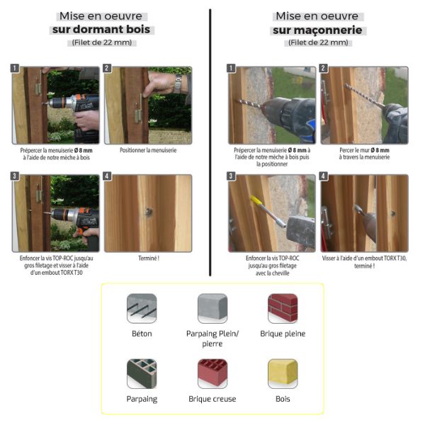 La menuiserie est maintenue en position par la tête de la vis.