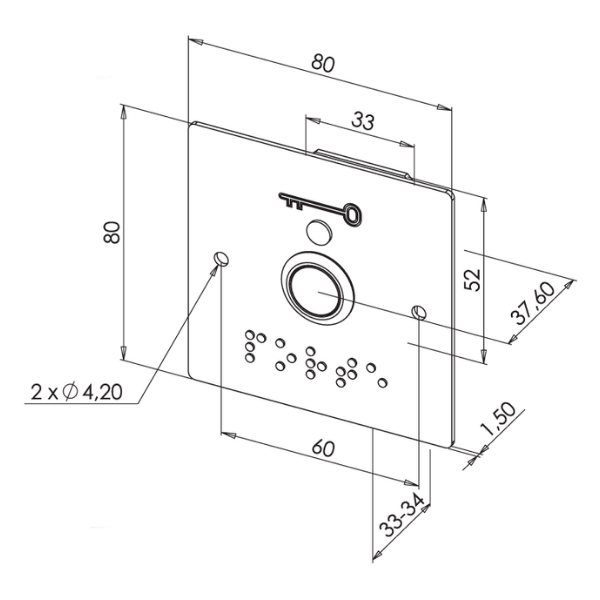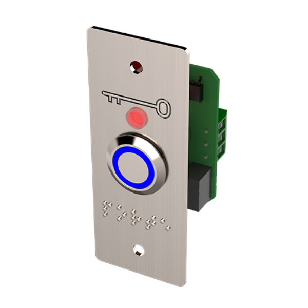 Monté sur plaque inox large, avec marquage (symbole clé et porte en écriture braille).Le montage peut s’effectuer en applique ou en encastré (montage possible sur pot de 60 mm).