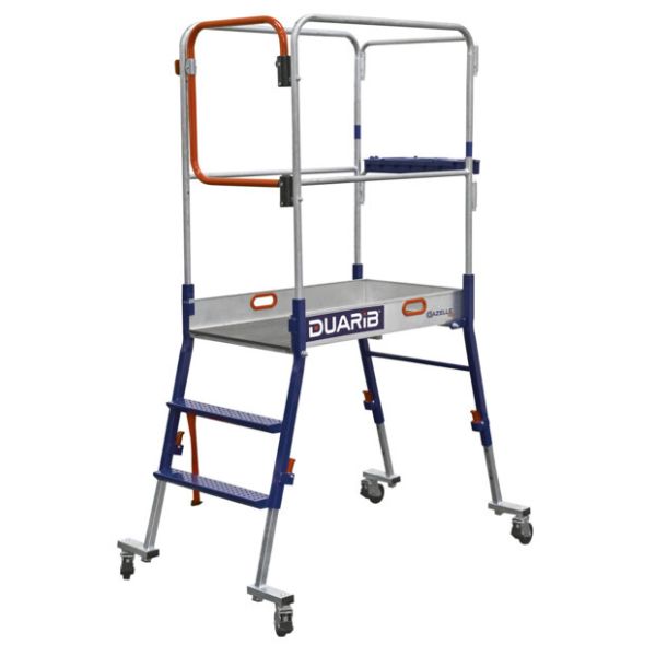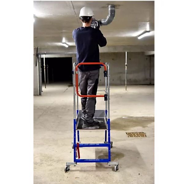 Accès par larges marches avec antidérapant puissanttablette multifonctions : porte-outils, porte-fûts2 poignées de manutention intégrées aux plinthesgarde-corps avec portillon4 roulettes Ø 80mm pivotantes et escamotables, non porteuse en position de travailaluminium / acier galvanisé3 haut. de travail : 2.60 - 2.70 - 2.80 m3 haut. de plancher : 0.60 - 0.70 - 0.80 m4 pieds ajustables en hauteurauto-stabledim. plié : H. 1.09 m x L. 0.78 m x Ep. 0.26 mdimensions hors tout : 1.35 x 0.78 mplancher ant [...]