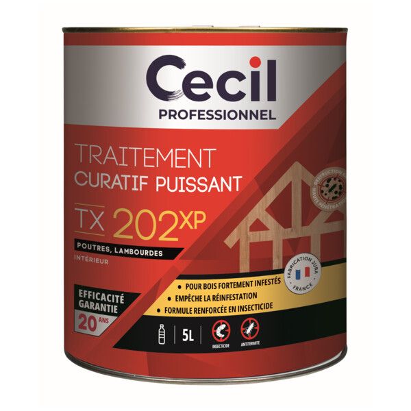 Traitement curatif des bois intérieurs (charpentes, poutres, lambourdes) très attaquéssolvanté : faible odeur à l'application, sans odeur après sêchageviscosité : fluideincolore, pénétration au c'9cur du boiscompatible avec tous types de finitions : lasure, vernis, peintures...prêt à l'emploiPerméthrine : 0.75%efficacité insecticide, préventif et curatif contre :- les insectes à larves xylophages capricornes, lyctus, vrillettes selon les normes EN 46, EN 22 et EN 370/73- les insectes xylo [...]