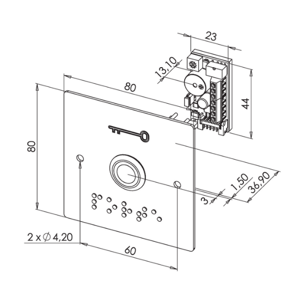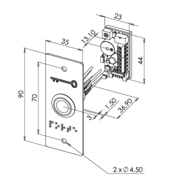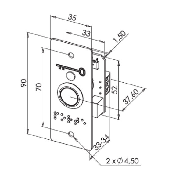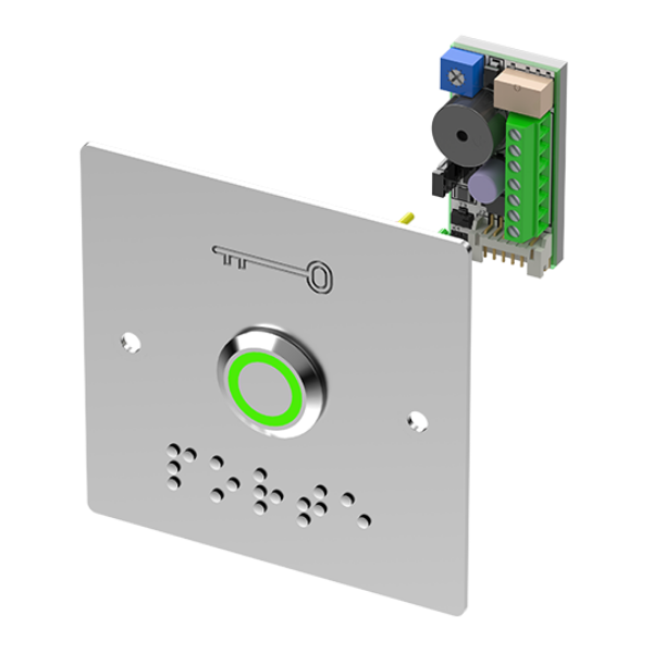 Monté sur plaque inox large, avec marquage (symbole clé et porte en écriture braille).Le montage peut s’effectuer en applique ou en encastré (montage possible sur pot de 60 mm).