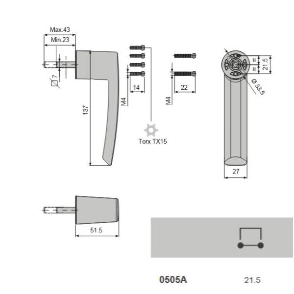 Poignée minimale NUX 21,5 mm - longueur de la tige carrée 23 - 43 mm.