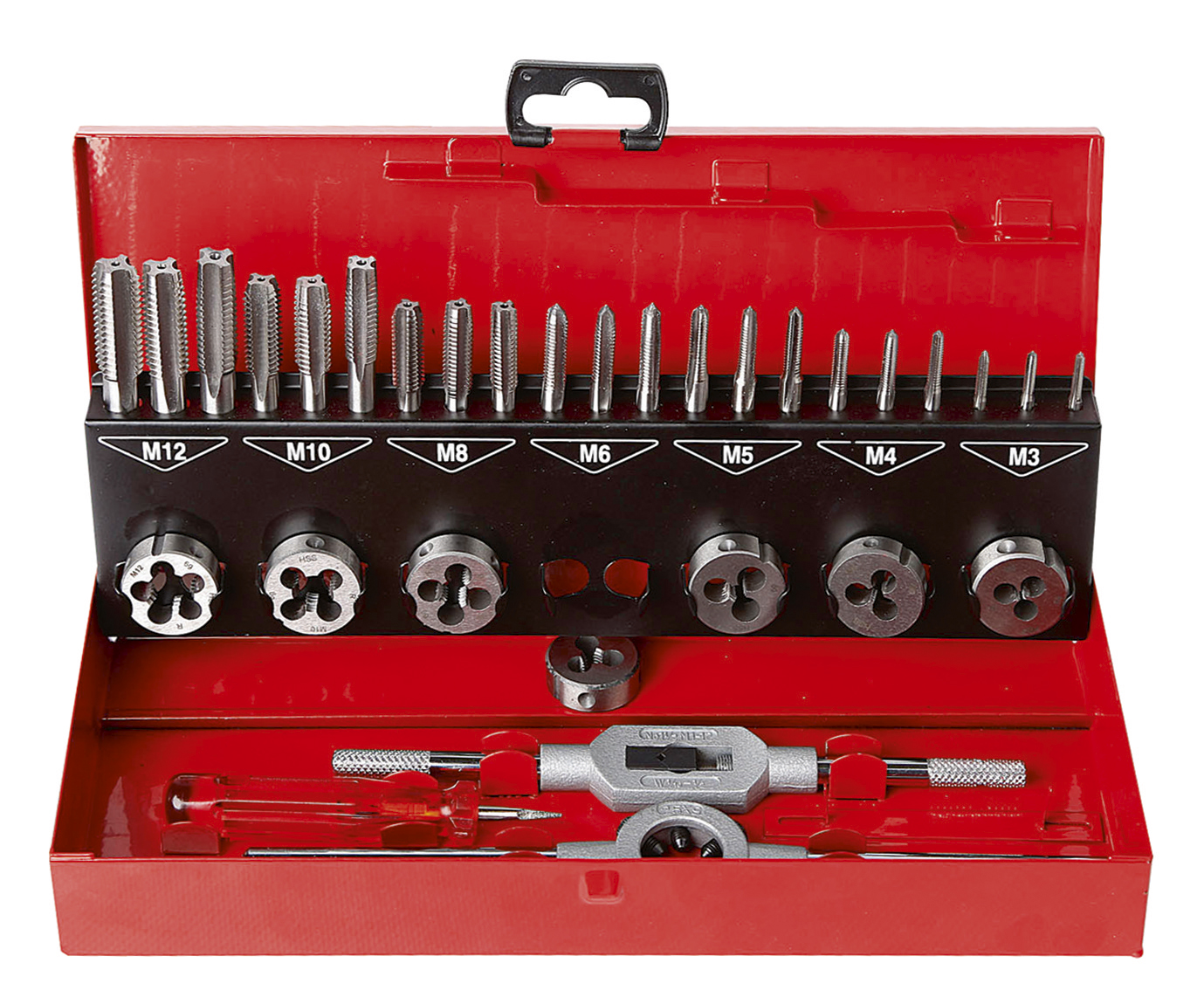 - 7 filières HSS Ø 25,4 mm M3-M4-M5-M6-M8-M10-M12
