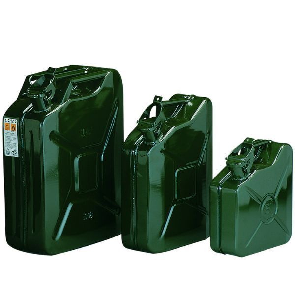 Jerrycan (jerrican) en tôle renforcée pour hydrocarbures aux normes UNpeinture spéciale de protection intérieurefermeture par bouchon à griffe à verrouillage rapidepoignée de transport livré sans bec verseur (en option).