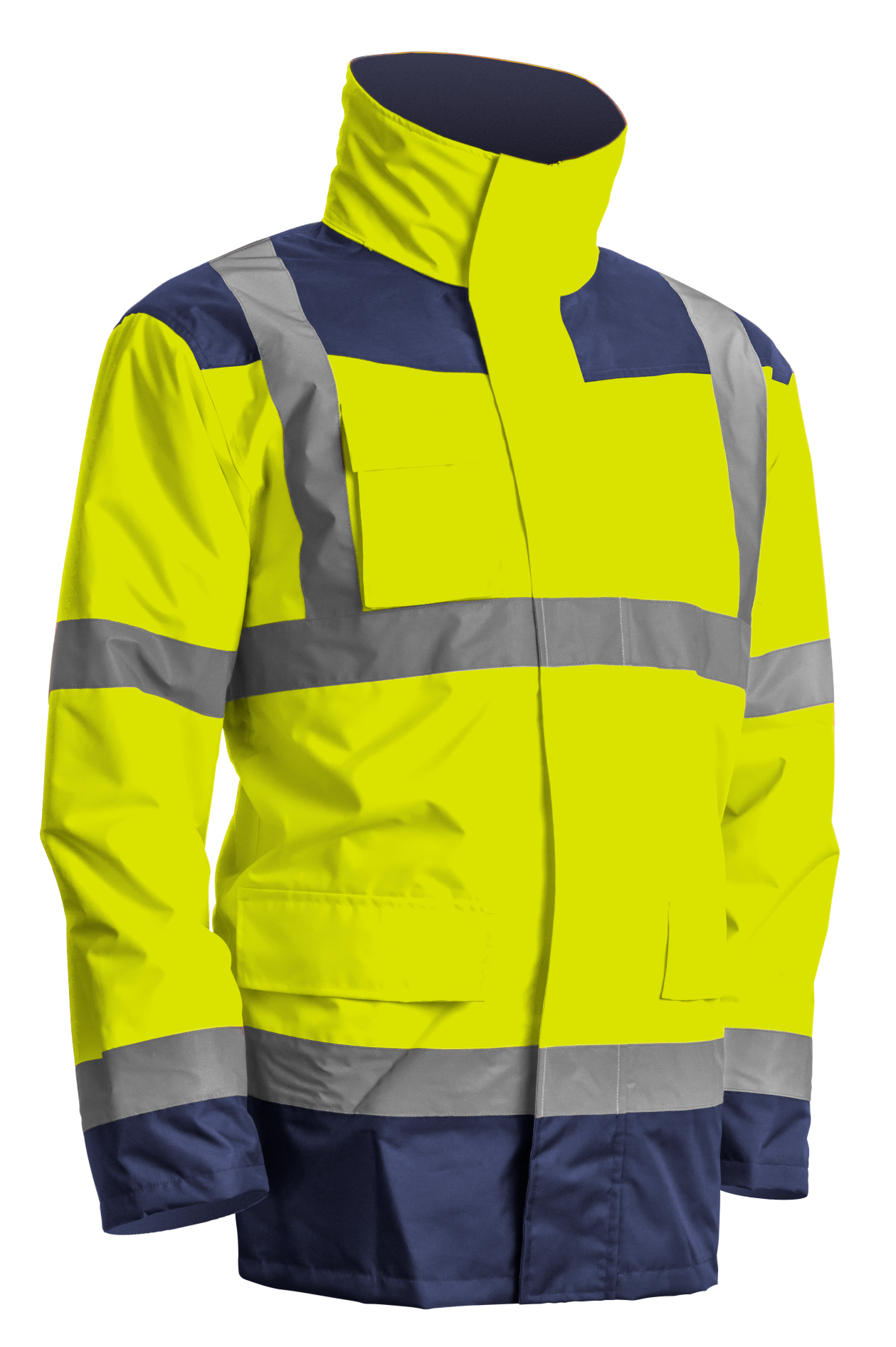 Parka 100% Polyester Oxford 300D fluorescent enduit PUCoutures étanchées, doublure Polyester pongéCapuche 3 pans intégrée dans le colEmpiècements bleu marine aux épaules, bout des manches et bas du parkaZipper central avec double curseur sous rabat jusqu'en haut du col1 poche extérieur poitrine + 2 poches intérieures (portefeuille + téléphone)VESTE INTÉRIEURE 2/1, manches amovibles 100% Polyester Oxford 300D fluorescent enduit PU, doublure polaire (corps) et polyester matelassé (manches)Poig [...]